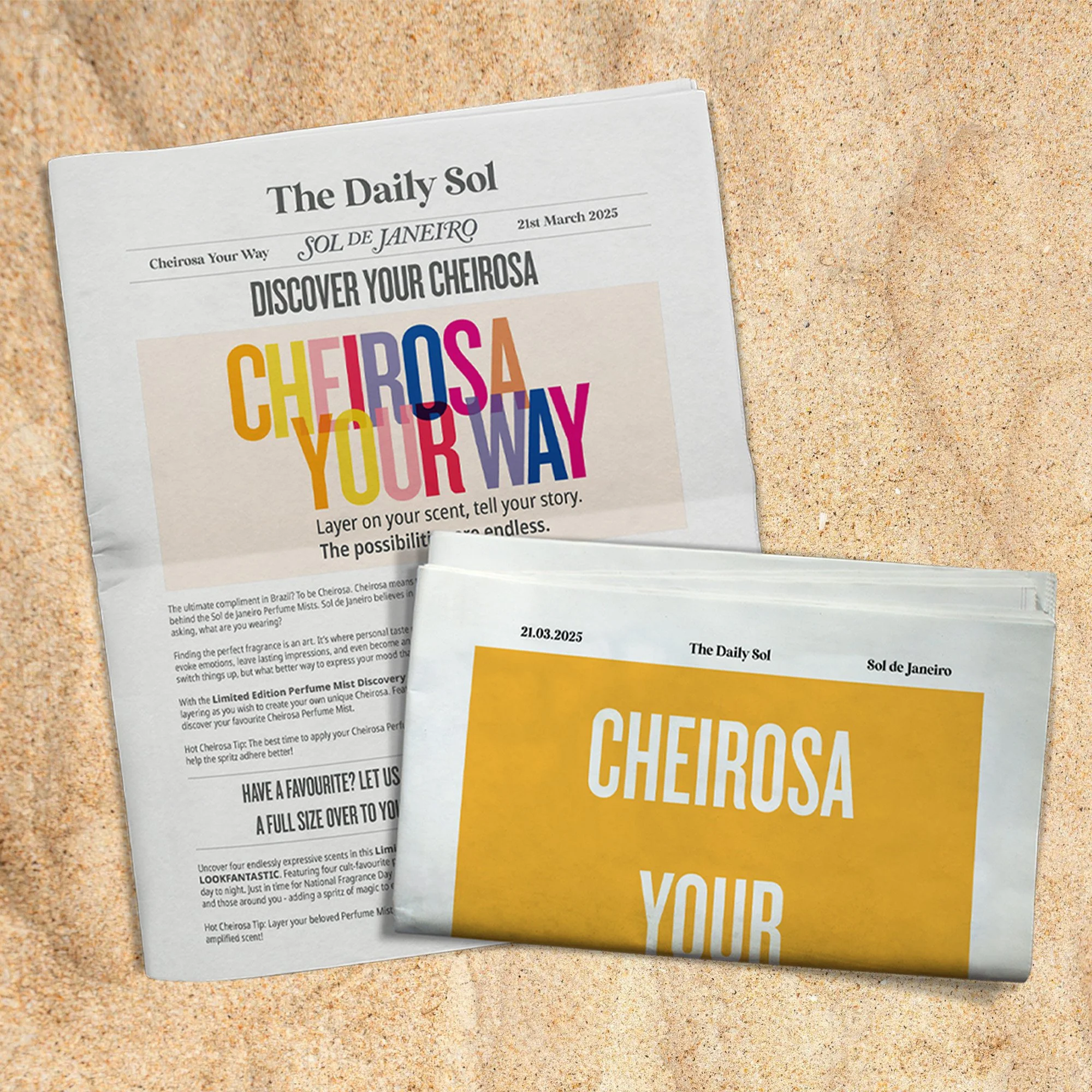 For National Fragrance Day 2025, the brand wanted to create a newspaper to send out to influencers. This would promote the range of Cheirosa products, a set of their signature perfume mists. I was given some assets, the dimensions and some light direction to create the small newspaper.